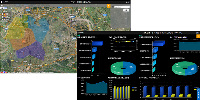 實時集中監控平臺以簡潔、美觀的圖表頁面,集中展現企業各環節經營數據。武漢移動經過多年信息化的建設,已形成區域化的業務管理體系,并積累了大量的業務數據。為清晰呈現各項指標在全市范圍內不同區域的整體情況,億信BI通過在GIS地圖上對各區域模塊進行顏色渲染,清晰展示企業業務區域的分布情況(如下圖左側所示),同時通過多TAB頁的展示方式(如下圖右側所示),以專題化(包括收入,用戶發展、4G發展等專題)的頁面,分析了各主題中不同項經營指標的排名,占比,趨勢以及對比情況,從而使決策者可快速定位自己所關心的重點數據。