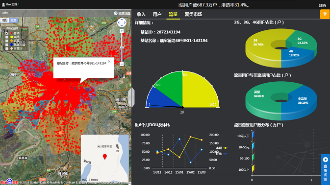 基于GIS地圖的沙盤式管理理念,依托于百度地圖的地理信息,結合武漢移動已有的業務數據,億信BI實現了對武漢移動各區域市場、企業客戶、渠道網點的集中管理和實時監控,真正實現了企業的沙盤式管理思想。