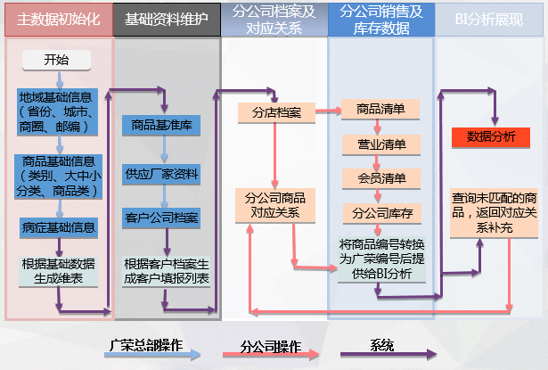 系統(tǒng)主要從醫(yī)藥零售角度,通過采集商品、運營、會員3方面的數(shù)據(jù),并建立廣榮自身的主數(shù)據(jù)庫,從而對連鎖藥店進行商品銷售、門店運營情況、各店會員行為數(shù)據(jù)進行分析。(2018年9月,廣榮醫(yī)藥新成立廣州睿思達咨詢公司,旨在專門依據(jù)此系統(tǒng),提供數(shù)據(jù)咨詢,優(yōu)化方案等服務(wù)。系統(tǒng)更名為“藥CT零售大數(shù)據(jù)BI系統(tǒng)”)
