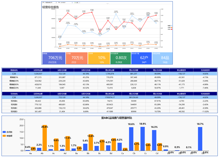 2、商品結(jié)構(gòu)管理:各零售藥店每月商品銷售情況,包括品單價、品項占比、銷售占比、價格帶、雙ABC、品類效益、理論與實際、關(guān)聯(lián)率、微定價等等。