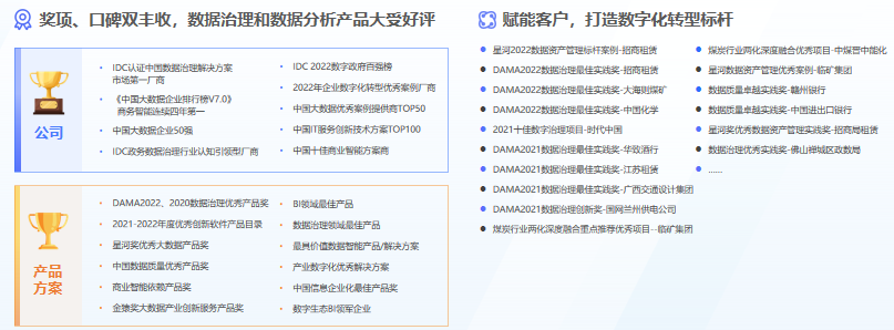 作為大數(shù)據(jù)行業(yè)的領(lǐng)軍企業(yè),億信華辰敏銳把握市場(chǎng)需求,精益求精不斷進(jìn)步,不斷打磨兩大核心產(chǎn)品——億信ABI與睿治數(shù)據(jù)治理平臺(tái)。憑借創(chuàng)新、易用、強(qiáng)大的特性,產(chǎn)品自發(fā)布以來(lái)持續(xù)領(lǐng)先于同時(shí)代其他產(chǎn)品,受到客戶廣泛認(rèn)可,打造出多個(gè)數(shù)字化轉(zhuǎn)型標(biāo)桿,并拿下眾多殊榮:多次入選Gartner《中國(guó)分析平臺(tái)市場(chǎng)指南》代表廠商,三度斬獲DAMA數(shù)據(jù)治理優(yōu)秀產(chǎn)品獎(jiǎng),蟬聯(lián)IDC中國(guó)數(shù)據(jù)治理解決方案市場(chǎng)第一……